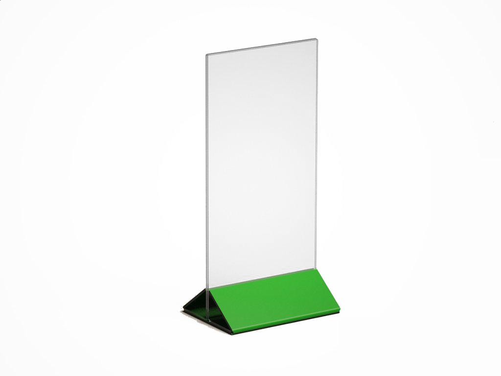 МЕНЮХОЛДЕР ФОРМАТА 1/3 А-4, С НИЖНЕЙ ЧАСТЬЮ РАЗЛИЧНЫХ ЦВЕТОВ, КЛАСИЧЕСКОГО ВИДА.  СОСТОИТ ИЗ ДВУХ ЧАСТЕЙ, ПРОЗРАЧНОГО Т-ОБРАЗНОГО ПЛАНШЕТА И НИЖНЕГО ДЕРЖАТЕЛЯ, ТРЕУГОЛЬНОЙ ФОРМЫ. ВОЗМОЖНО НАНЕСЕНИЕ ЛОГОТИПА.