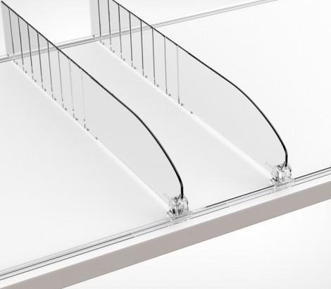 Разделитель DIV60-В выс.60 мм без ограничителя - предназначен для организации выкладки небольших лёгких товаров, таких как сигареты, лекарства, парфюмерия и косметика. материал: прозрачный ударопрочный пластик, имеет насечки с шагом 25 мм для обламывания по длине. Особенности: подходит для полок глубиной 200–400 мм. Задняя часть разделителя разделена на фрагменты, которые можно отрезать, чтобы регулировать длину. Для крепления на полку нужны специальные профили, которые фиксируются на переднюю и заднюю стороны полки. На передней и задней части разделителя есть вырезы (замки) для фиксации на профиль.