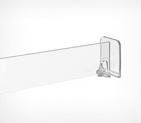 Разделитель DIV30-BT35 выс.30 мм с передним ограничителем — пластиковый разделитель с передним ограничителем. Имеет насечки с шагом 25 мм для обламывания по длине, материал: прозрачный ударопрочный пластик. Применение: для организации выкладки небольших лёгких товаров, таких как сигареты, лекарства, парфюмерия и косметика. Особенности: ограничивает падение товара с полки, крепится на Т-профили на переднем и заднем крае полки.