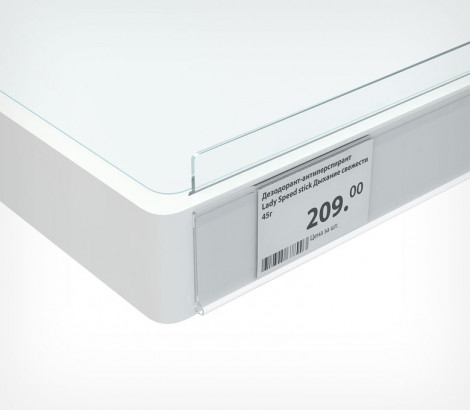 DBR 30 — полочный самоклеящийся ценникодержатель высотой 30 мм. Используется для размещения цен в магазинах с оборудованием, не имеющем широких поверхностей для монтажа стандартных решений, или на промо-дисплеях.